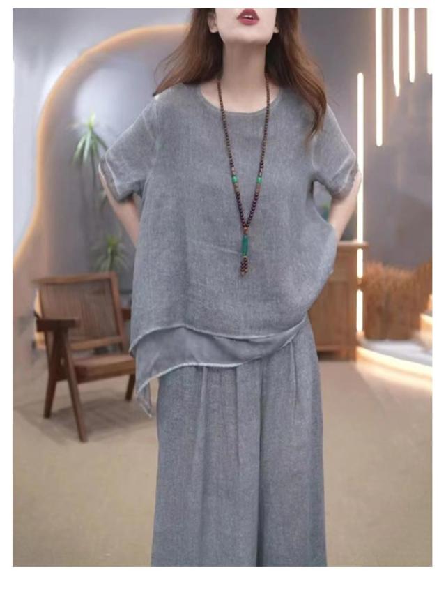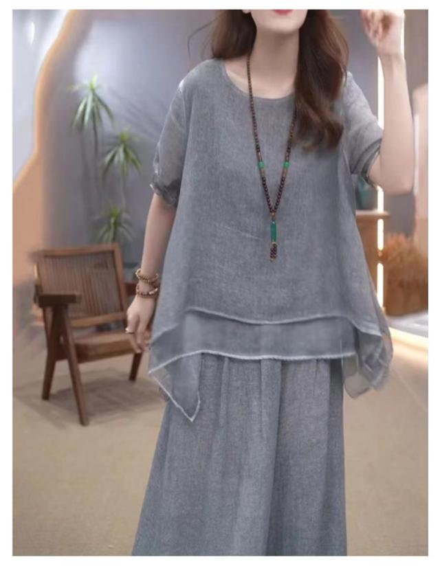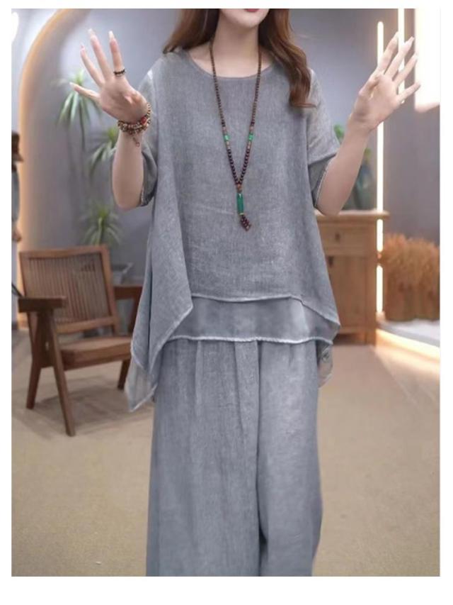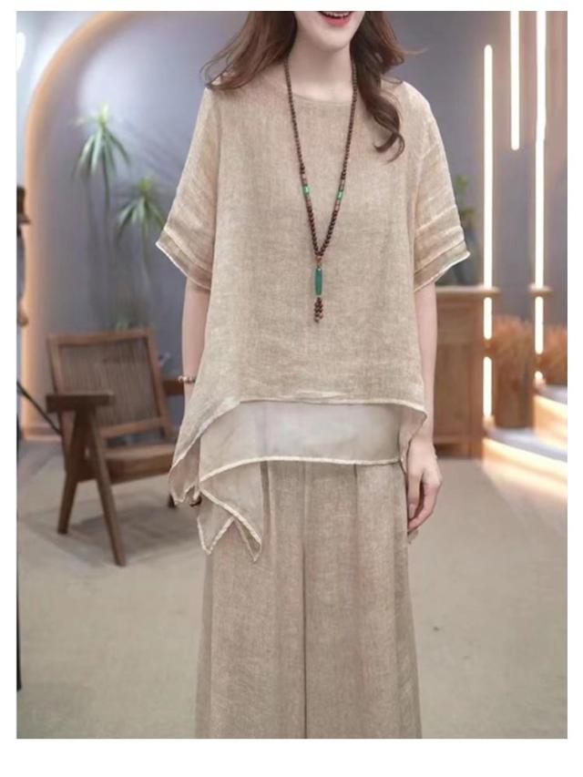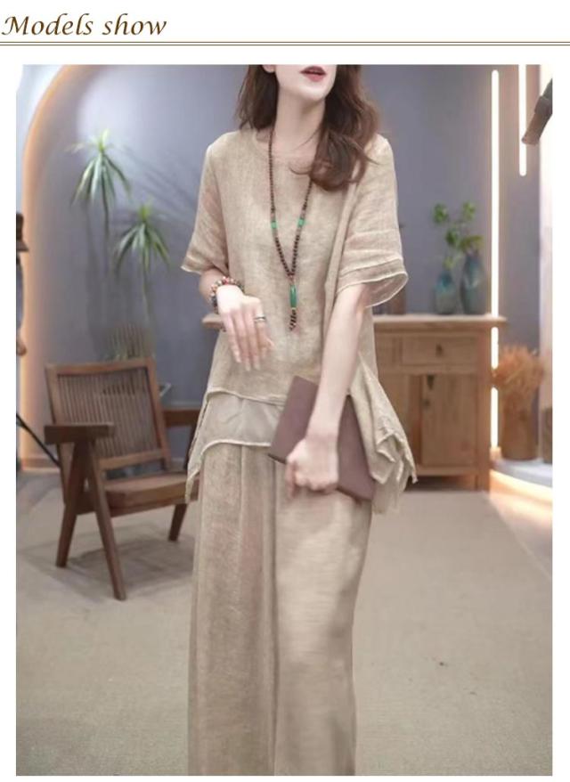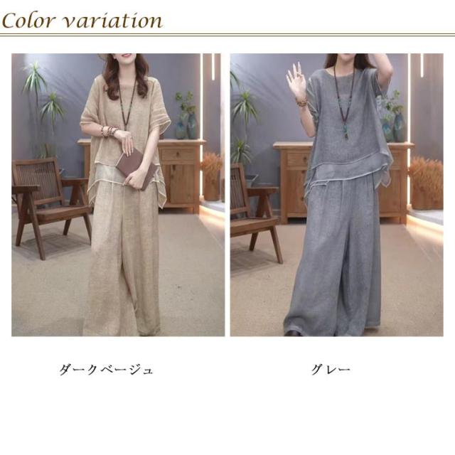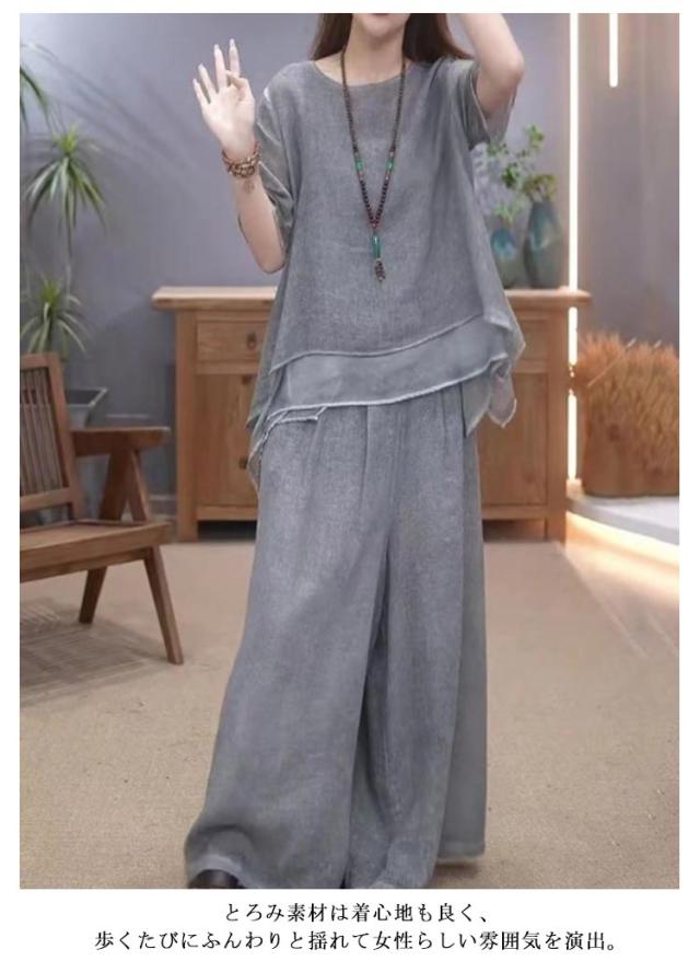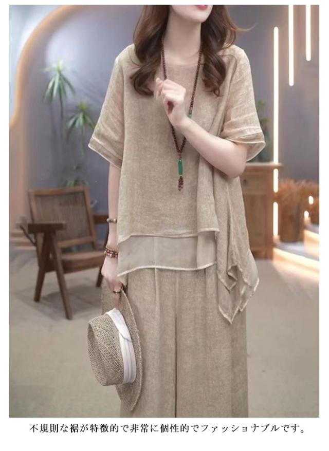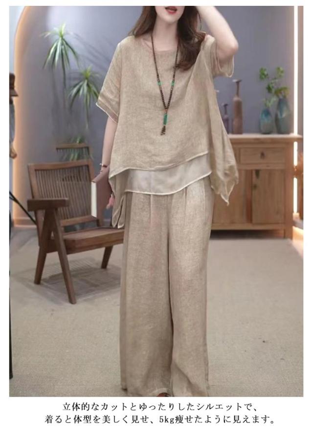 セットアップ レディース 綿麻 半袖 トップス ワイドパンツ 上下セット 軽量 春 夏 ロングパンツ きれいめ カジュアル シンプル ゆったり おしゃれ 大きいサイズ 柔らか 透气 体型カバー 通勤 通学 デート ママコーデ 40代