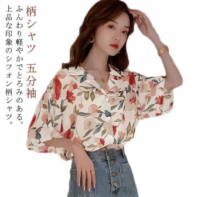柄シャツ 五分袖 レディース アロハシャツ 開襟 花柄 総柄 ブラウス 半袖 シャツ オーバーサイズ レトロ ヴィンテージ 柄プリント 大人可愛い 総柄シャツ シフォン シアー トップス 透け感 とろみ ビーチ リゾート デイリー 【送料無料】