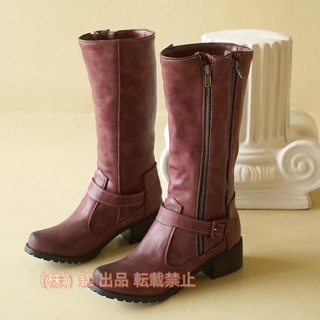 ロングブーツレディースジョッキー本革調高筒靴ベルト飾りサイドジップローヒール秋冬ベルトバックル大きめラウンドトゥ株式会社錦太めヒール防滑脚長効果