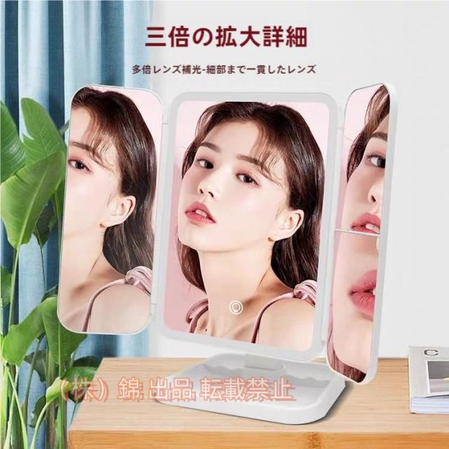 女優ミラー 化粧鏡 卓上ミラー LEDライト付き 三面鏡 2倍&3倍拡大鏡 株式会社錦三面鏡 180°回転 52個LED 折りたたみ メイクミラー
