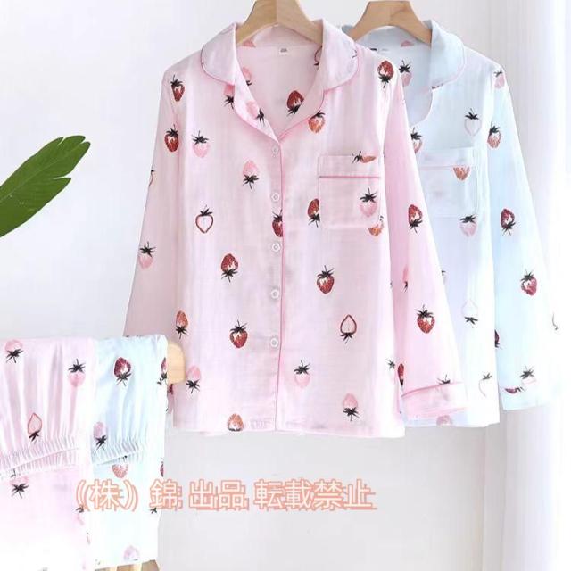 パジャマ レディース 長袖 ダブルガーゼ 長ズボン イチゴ柄 ルームウェア Vネック 果物柄 部屋着 寝巻き シンプル ウエストゴム 株式会社錦 オールシーズン