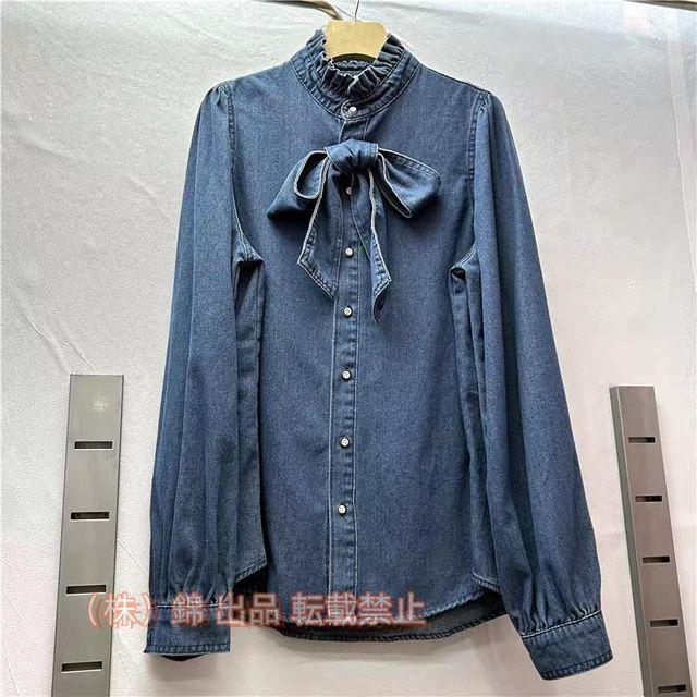 ブラウス レディース ス シャツ デニム 立ち襟 フリル リボン ボウタイ 株式会社錦長袖 春 春服