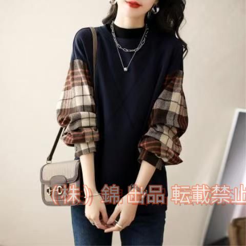 Tシャツレディース40代秋冬長袖スウェットシャツおしゃれ韓国風トップスチェック柄切り替えパフスリーブプルオーバー株式会社錦カジュアル30代20代