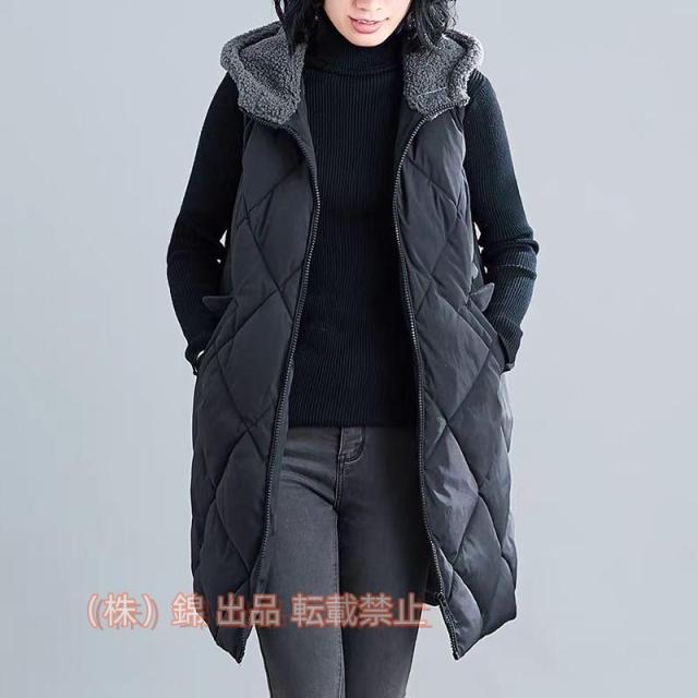 ロングベスト レディース 膝上 ベスト キルティング フード付き カジュアル風 防寒 大きいサイズ 株式会社錦 中綿ベスト ダウンベスト 無地 シンプル 暖かい