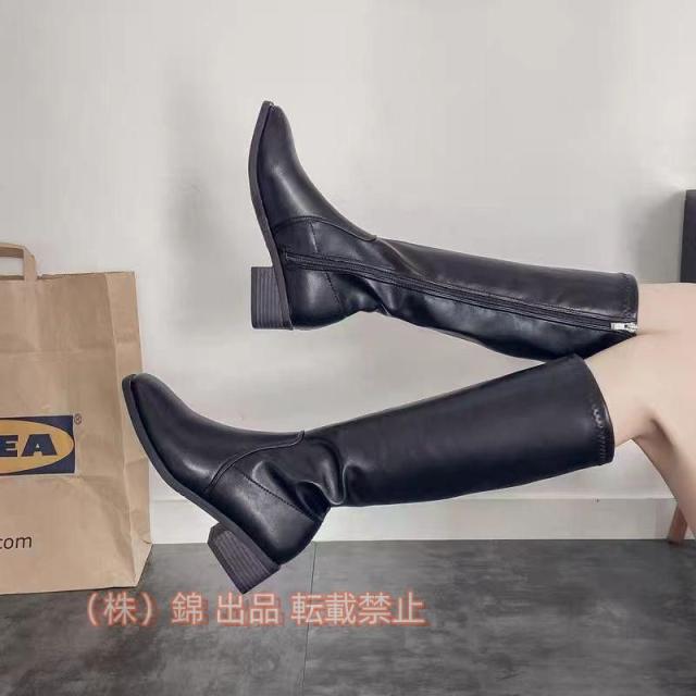 ロングブーツ レディース スクエアトゥ カジュアル 細身 ブーツ ローヒール ジョッキーブーツ 茶錦 黒 膝丈ブーツ 2cm 太ヒール 美脚 ファッション フェミニン