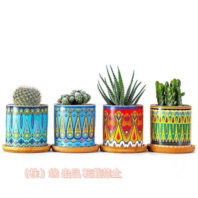 鉢サボテン植木鉢陶器鉢鉢カバー観葉植物多肉植物鉢ミニ観葉植物適用植物なし底穴付き竹製トレイ付き4点セット卓上錦室内用花器プレゼントおしゃれ