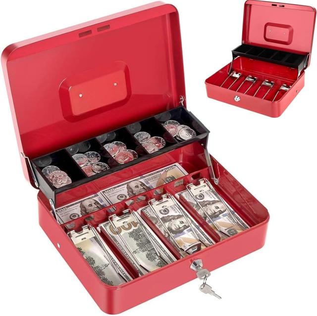 小口現金ボックス: このロックボックスは耐久性のあるスチール製で、しっかりと作られており、落としても簡単に破裂しません。屋内と屋外で使用できます。学校、スーパーマーケット、収納ロッカー、キャビネット、家族、ヤードセールなど。手提げ金庫小型小紙幣、コイン、小切手、領収書の保管に適しています。