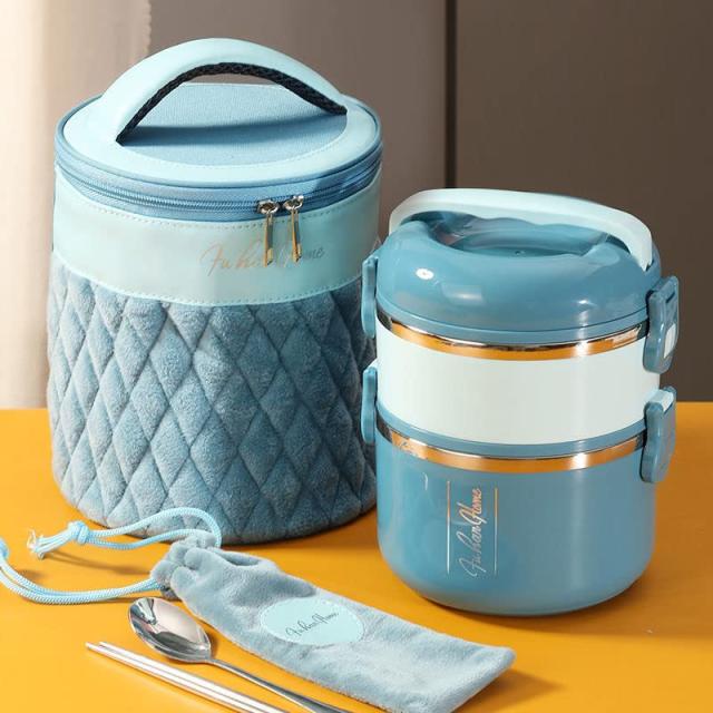 お弁当箱保温ランチジャー保温弁当箱二段おべんとう箱弁当バッグ付きお箸とスプーン付き真空断熱こども大人女性男性兼用錦通勤通学(ピンク2層【ハ