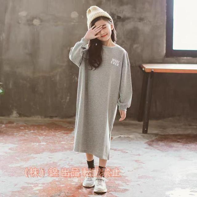 子供服 キッズ ワンピース ロング丈 マキシワンピース 長袖 カットソー ガールズ 女の子 女児 ジュニア 韓国こども服 株式会社錦 プリント柄 スリット 春秋