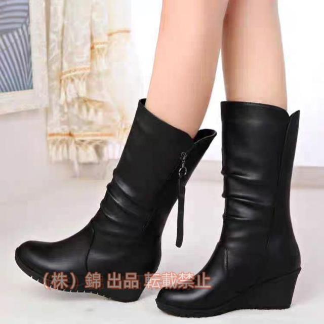 レディースロングブーツ本革調ラウンドトゥ厚底ウェッジヒールエンジニアブーツサイドジッパー裏起毛株式会社錦くしゅくしゅ7cmシークレットシューズ長靴
