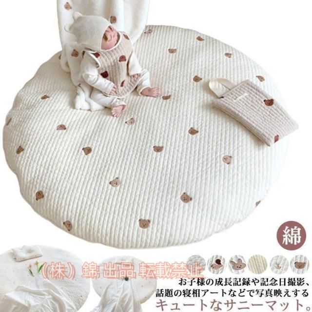 サニーマット ベビー ラグ マット 円形 ごろ寝 寝相アート 月齢フォト マット株式会社錦 綿 赤ちゃん お昼寝マット 刺繍 クマ 花柄 ウサギ リス オリーブ