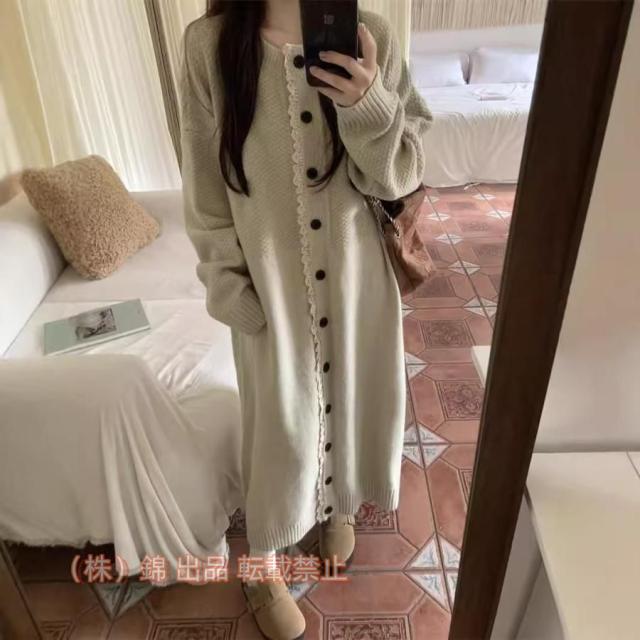 ニットワンピース レディース マキシワンピース ロングワンピース ロング丈 マキシ丈 株式会社錦クルーネック 長袖 前開き ボタン付き