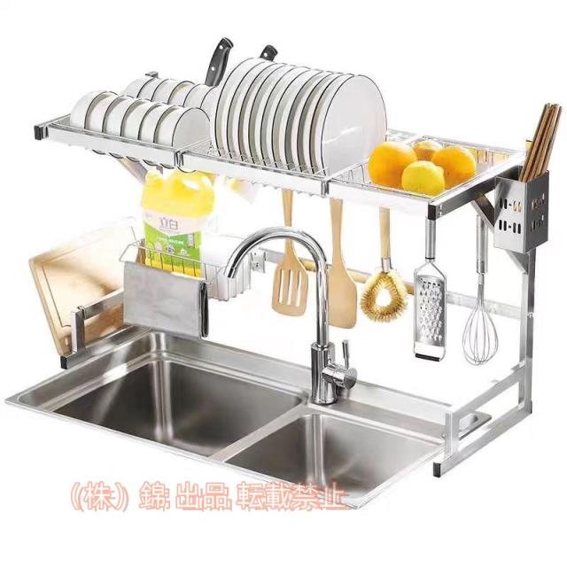 【商品仕様】サイズ:幅65cm×奥31.5×高さ51.5cm幅75cm×奥31.5×高さ51.5cm幅85cm×奥31.5×高さ51.5cm幅95cm×奥31.5×高さ51.5cmカラー:ステンレス、ブラック耐荷重:60kg素材:304ステンレス製生産国:中国◇大容量の収納力2段式ラックなのでさまざまなキッチン用品を分類して収納できます。◇耐荷重60kgたくさん収納しても大丈夫な頑丈設計なので、安心してお使いいただけます。◇安定感のあるフレーム滑り止め吸盤付きなので安定感があります。◇付属パーツ付き付属パーツは引っ掛け式なので、自由にカスタムして収納売ることができます。◇サビにくいオールステンレス製◇シンプルなデザイン※ご注文前にシンクの高さと蛇口の高さを確認してください。