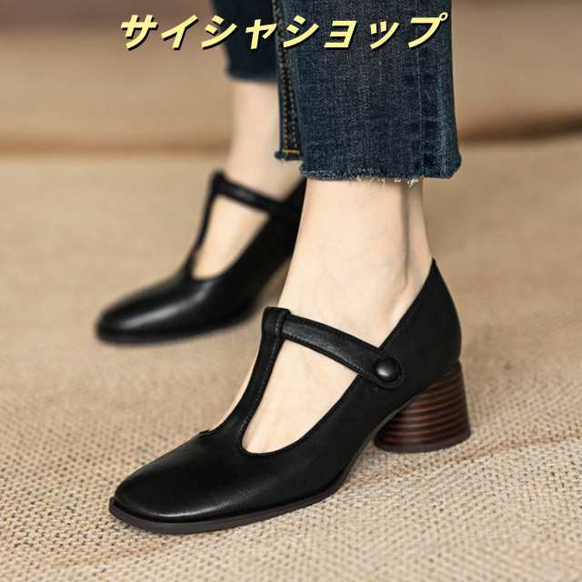 ミドルヒール Tストラップ パンプス 痛くない 太ヒール 走れる ラウンドトゥ 靴 ストラップ 結婚式 フォーマル 歩きやすい ローヒール お