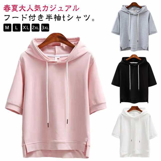 レディース トップス 半袖パーカー 夏物 五分袖 カットソー Tシャツ 半袖パーカー トップス 半袖tシャツ フード付き 無地 ゆったり プルオーバー Tシャツ 大きいサイズ カジュアル 綿 コットン 大人気 薄手 春 夏 おしゃれ