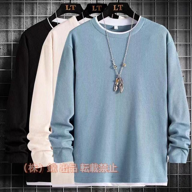 メンズ 長袖 Tシャツ クルーネック 丸ネック カットソー ワッフル生地 重ね着風 トップス カジュアル おしゃれ コーデ シンプル かっこいい 通勤 通学 部屋着 運動着 ファッション 春 秋
