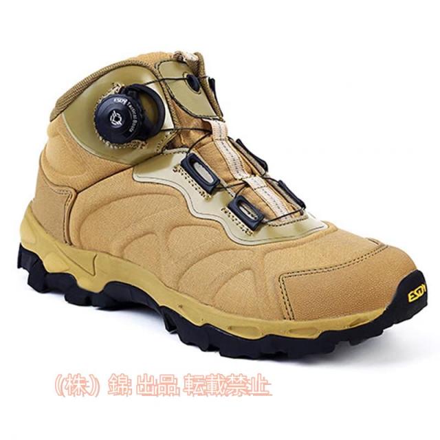 グリップ力、耐久性、通気性、軽防水性を備えるタクティカルブーツ。ダイヤル式で簡単に脱ぎ履きができます。