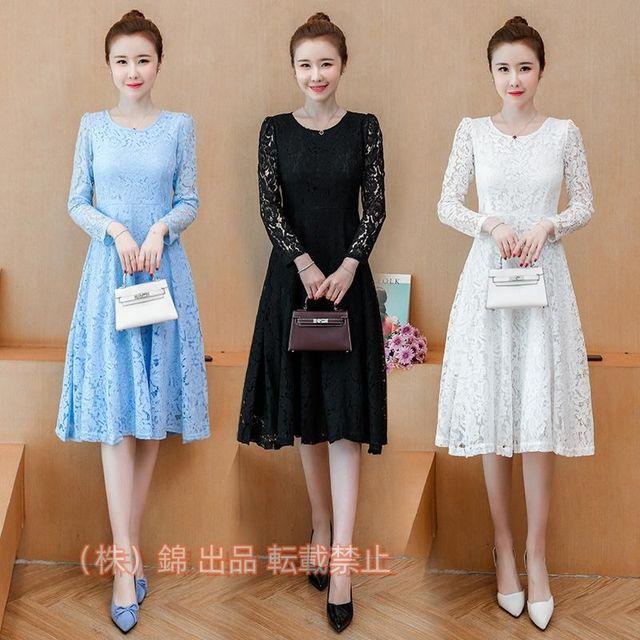 パーティドレス ロング 袖あり 長袖 レース Aライン 体型カバー 大きいサイズ 総レースワンピース 秋 春 結婚式 二次会株式会社錦 お呼ばれ