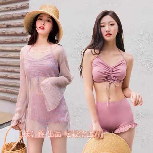 ホルターネック水着上下にシースルートップスのレディース水着3点セット