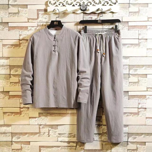 セットアップ メンズ 春秋 薄手 リネンセットアップ ゆったり 上下セット 綿麻 長袖 Tシャツ ロングパンツ