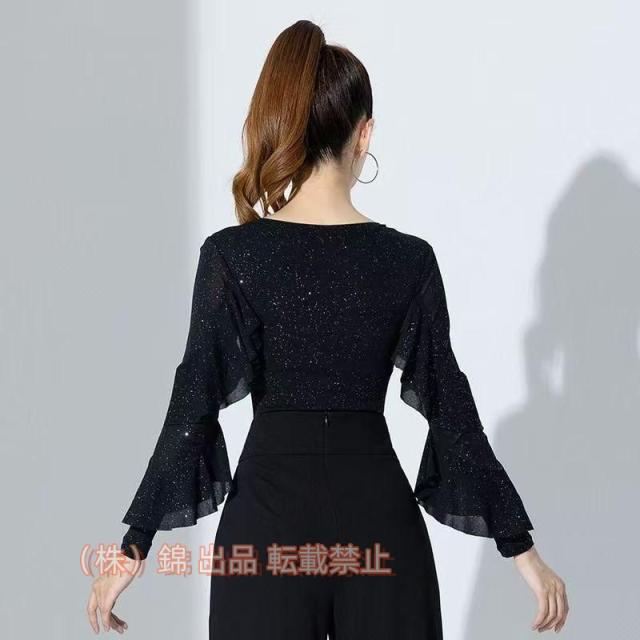 送料無料ラテンダンス衣装社交ダンストップスモダンダンス長袖キラキラブラックブルーパープル無地株式会社錦透け感ベリーダンス衣装レッスン着ダンスウェア