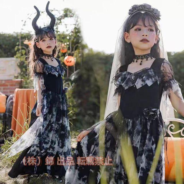 ハロウィン コスプレ 子供 巫女 魔女 ウィッチ 仮装 衣装 ゴシック ゴスロリ 暗黒系 悪魔 衣装 ロング丈 ワンピースハロウィン コスプレ衣装 子供 悪魔 巫女 ウィッチ 仮装 変装 女の子 半袖 ロング丈 ワンピース レース 裾フリル ゴスロリ ゴシック 暗黒系 デビル ゾンビ 吸血鬼 衣装 バラ花のベール付き2点セット ネックレス 髪飾り等小物追加可 黒 110 120 130 140 150