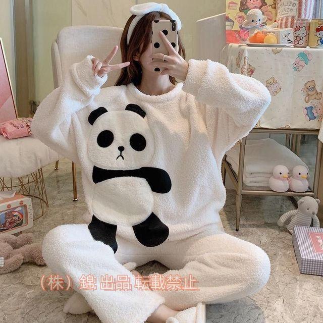 レディースふわもこ パジャマ ルームウェア 暖かい もこもこ防寒 パンダ柄厚手ふわふわ部屋着 ナイトウェア 株式会社錦上下2点セット 超可愛い シンプル新品