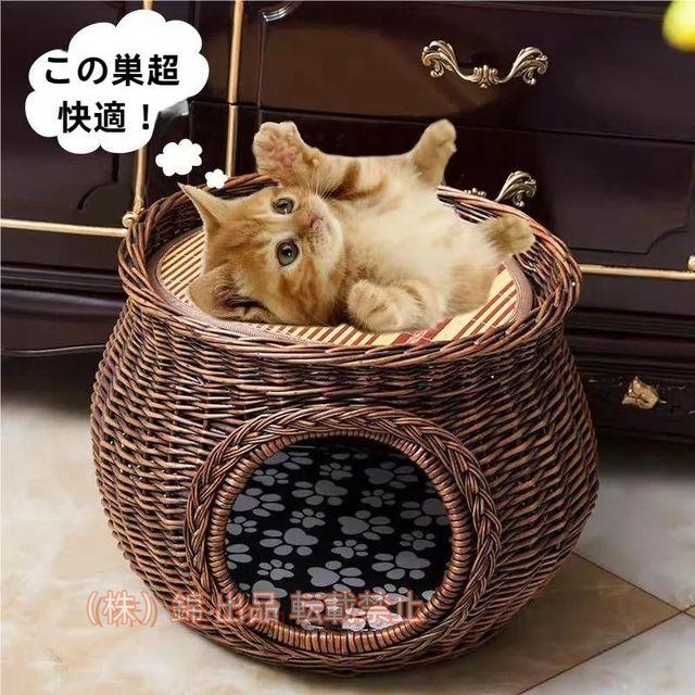 頑丈ラタンでハンドメイドのキャットハウスです。耐噛み、軽量、頑丈等の特性を持ち、長持ちします。更に猫の爪とぎとしても活用できます!オールシーズン夏には、直接使用できます。冬には、暖かい綿パッドがマットの上に置かれている限り、ワンちゃんやねこちゃんに暖かい冬を過ごさせてもらえます。猫に安心感を与えるドーム型ベッドです猫は狭いところで身を隠して眠れることが大好きなので、 下のかごの中に丸まって眠れるので、猫ちゃんが落ち着いてリラックスして過ごせますお手入れしやすいクッション部分を取り外して洗えるので、 汚れてしまったときも簡単にきれいにでき、いつでも清潔を保てます和式デザイン手つくり物で、よく質感があり、落ち着く雰囲気が生み出し、家のインテリアにも良く似合いますので、使い勝手の良いペットベッド。