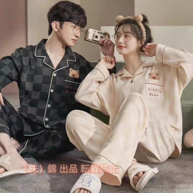 パジャマカップルペアルックパジャマ春秋冬長袖ルームウェアペアパジャマ錦前開き可愛い熊チェック柄上下セットオシャレレディース/メンズ部屋着ギフト