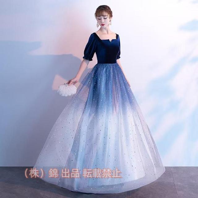 ドレス イブニングドレス ロングドレス スパンコール 星柄 パーティードレス ベロア ベルベット 紺色 ワイン赤 株式会社錦結婚式 成人式 二次会 パフスリーブ