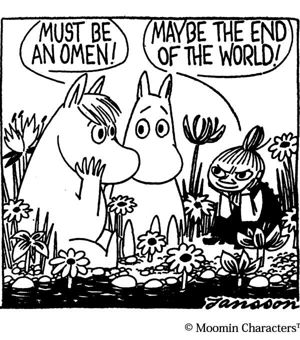 ムーミン、リトルミイ、スノークのおじょうさんはこれからどうなってしまうのかと話あっています。