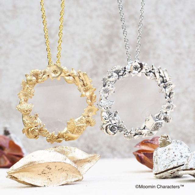 ムーミンと仲間たち、そしてムーミンのお話の中でトーベヤンソンが描いた美しい草花を加えたリース状のルーペペンダントを金色・銀色の2色でご用意しました。