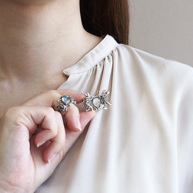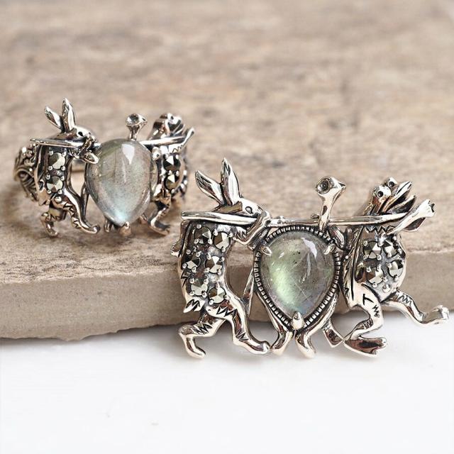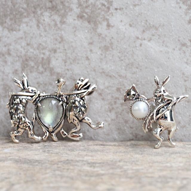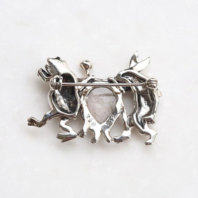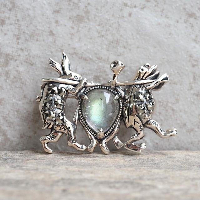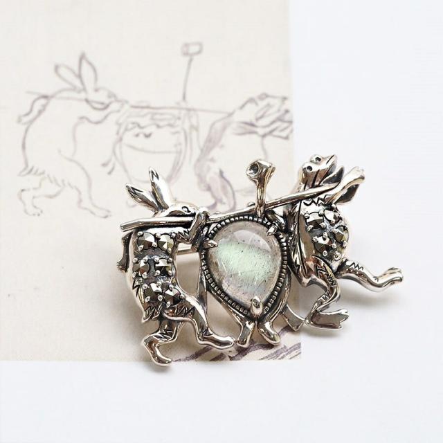 鳥獣戯画 宴会の準備 うさぎ 蛙 ブローチ シルバー ラブラドライト 925 兎 カエル 銀細工 装飾 彫刻 繊細 芸術 美術 日本画 国宝 アート メンズ
