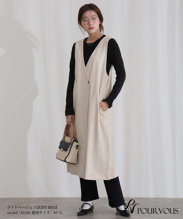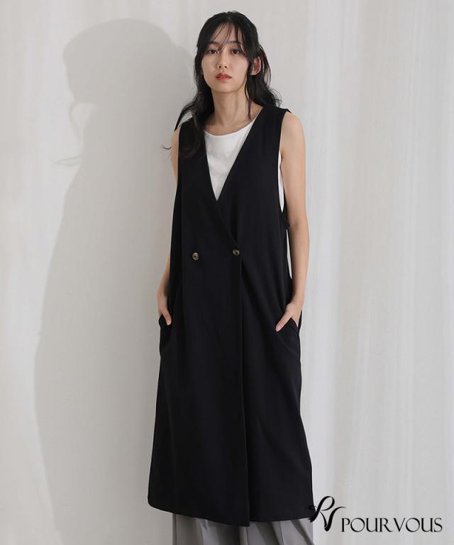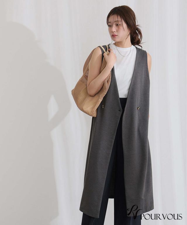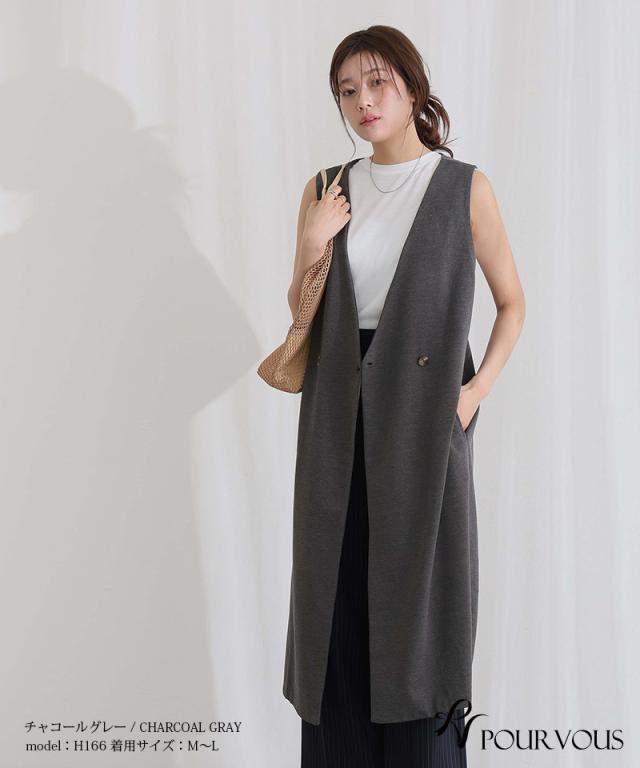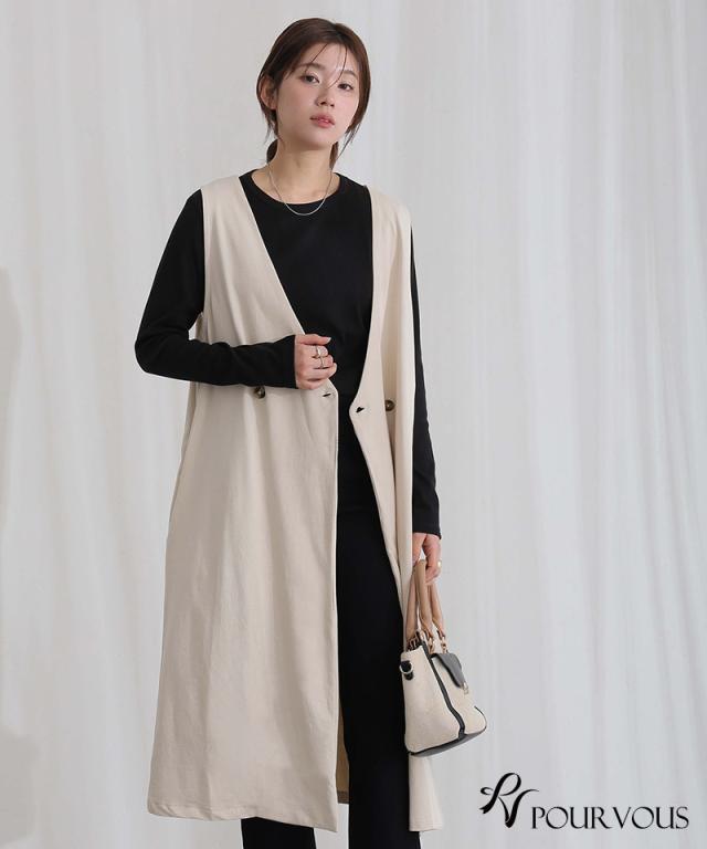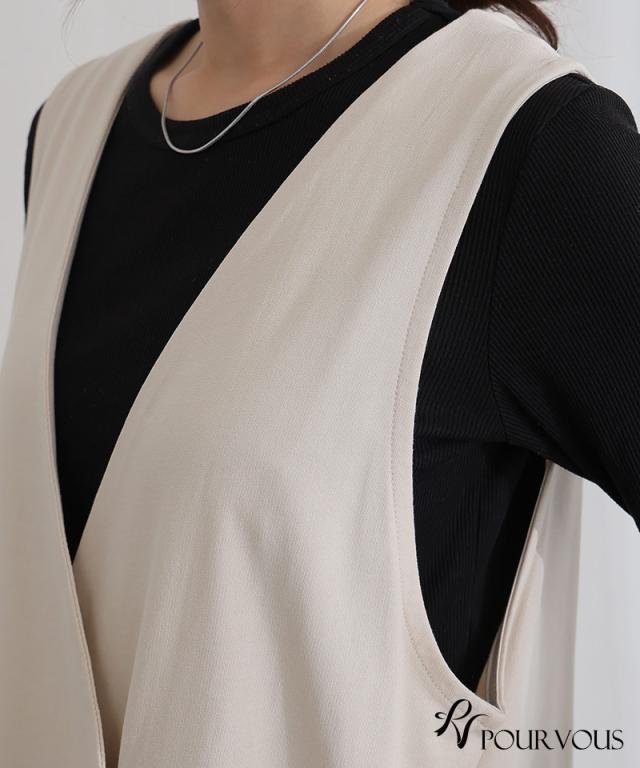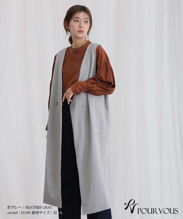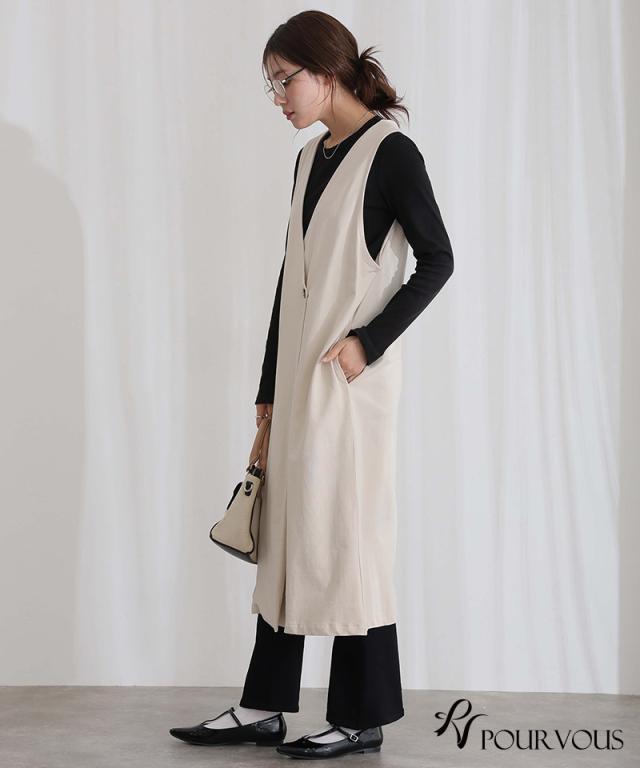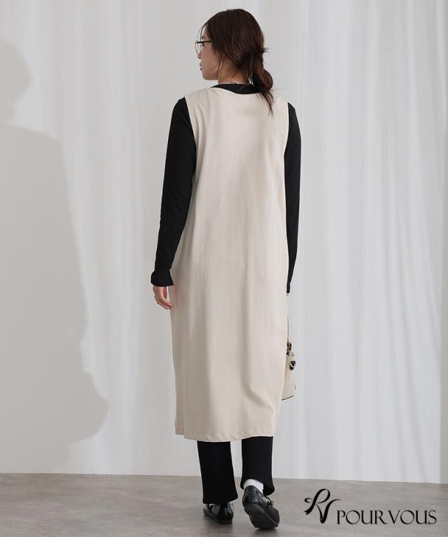 384251126 ミニ裏毛 ノーカラー リラックス ロングベスト ノースリーブ 半袖 vネック 無地 ロング ゆったり 着回し 着やせ シワになりにくい 韓国 体型カバー オーバーサイズ 大きめ 大きい