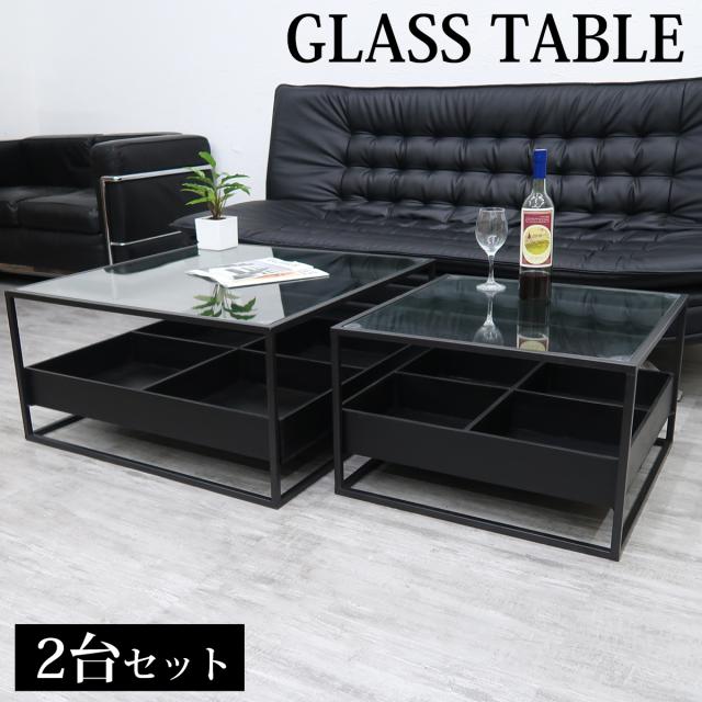 センターテーブル 2台セット ガラステーブル スクエア サイドテーブル ローテーブル 高級 収納付き 棚 机 ガラス モダン 北欧 インダストリアル おしゃれ ソファ パソコン 店舗 直径80cm 60cm CT-06