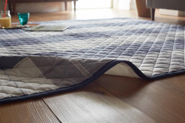 先染めの色糸で織り上げた綿100%の生地で、肌触りのいいキルトラグです。シックなネイビーのブロックチェックデザインが、お部屋をモダンな印象に彩ります。ふんわりと程よい厚みのラグは、ごろんと寝そべるのに最適です。