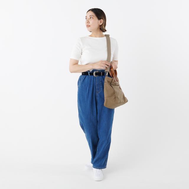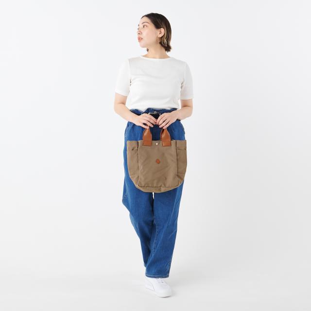軽量で耐久性に優れたナイロン仕立ての2WAYバッグ。比較的雨や汚れに強くメンテナンスもしやすい素材なので、利用シーンを問わず安心して連れ出せるのが嬉しいポイントです。柔らかな質感の本体が収納力にも貢献しており、中には長財布、ペットボトル、折り畳み傘、お弁当箱、ポーチなど嵩張りやすいアイテムを一同に収めることができました。