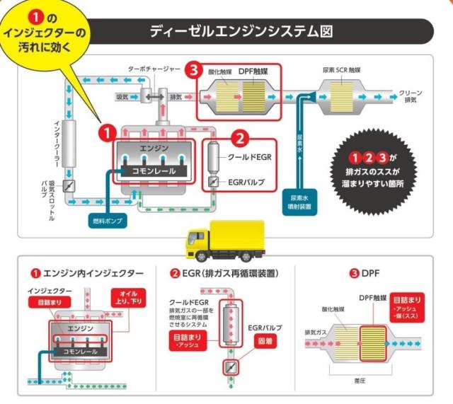 ・PM(煤)の発生量を低減し、DPF・EGR・インジェクターの長寿命化とDPF強制燃焼回数減少の効果も期待