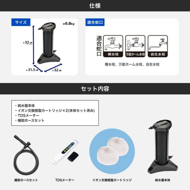 [付属品]イオン交換樹脂カートリッジ×2(本体セット済み)、TDSメーター、補助ホースセット