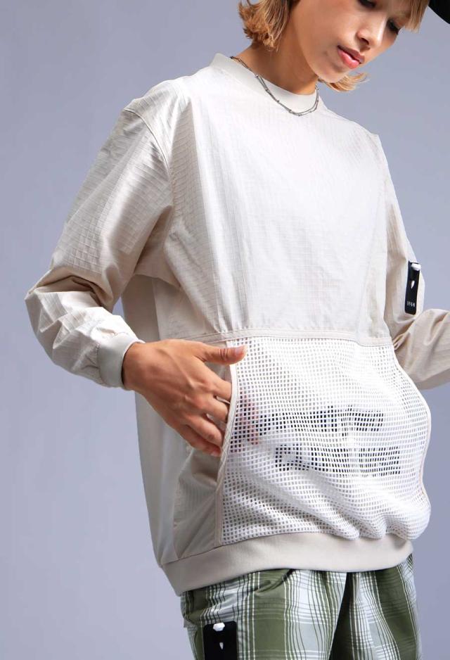 軽量で通気性に優れた格子状の素材に、透け感のあるメッシュポケットとブランドロゴプリントを施し、無地ベースながら存在感のあるデザインに仕上げました。