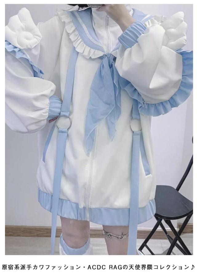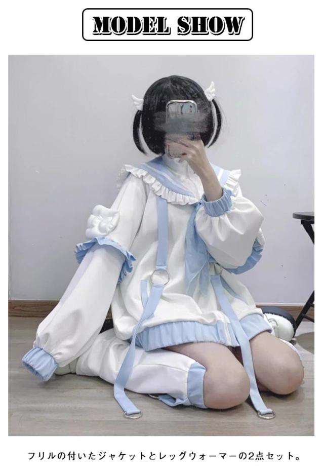 水色 地雷系 長袖 半袖 パーカー レッグウォーマー 2点セット サブカル フリルジャケット ブルゾン アウター リボン付き 原宿系 ファッション セットアップ 上下セット 地雷系 服 セーラー風 サブカル地雷 天使界隈 天使 水色界隈 セーラー服 レディース メンズ 【送料無料】