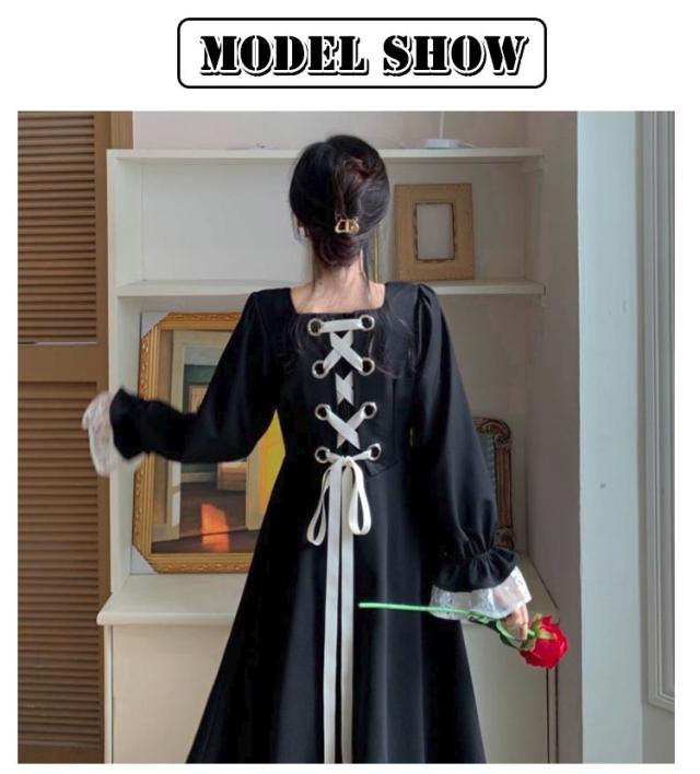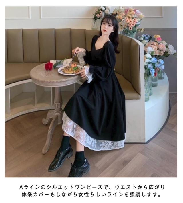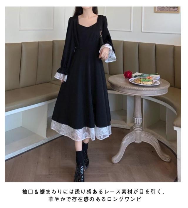 量産型 ゴシック ワンピース 長袖 ロング丈 レディース レース ロングワンピース 天使界隈 地雷系 服 レースアップ バックコンシャス ハイウエスト Aラインワンピース レース裾 可愛い 薄手 春 夏 秋 通気 サブカル系 【送無】