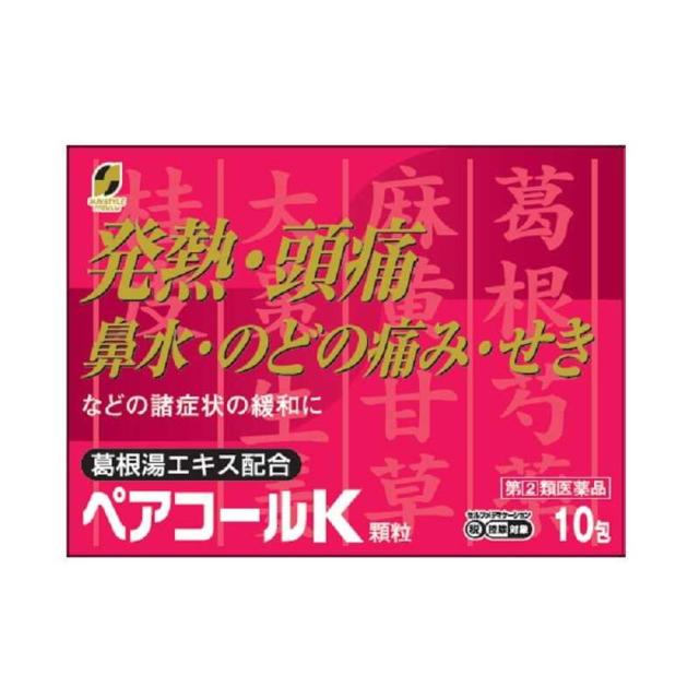ペアコールK顆粒は、かぜの初期症状に古くから用いられている漢方処方である葛根湯エキスと、解熱鎮痛剤、抗ヒスタミン剤、鎮咳剤、去痰剤などを効果的に配合した、顆粒タイプのかぜ薬です。さらに薬による胃腸障害をおさえるために制酸剤も配合されています。
