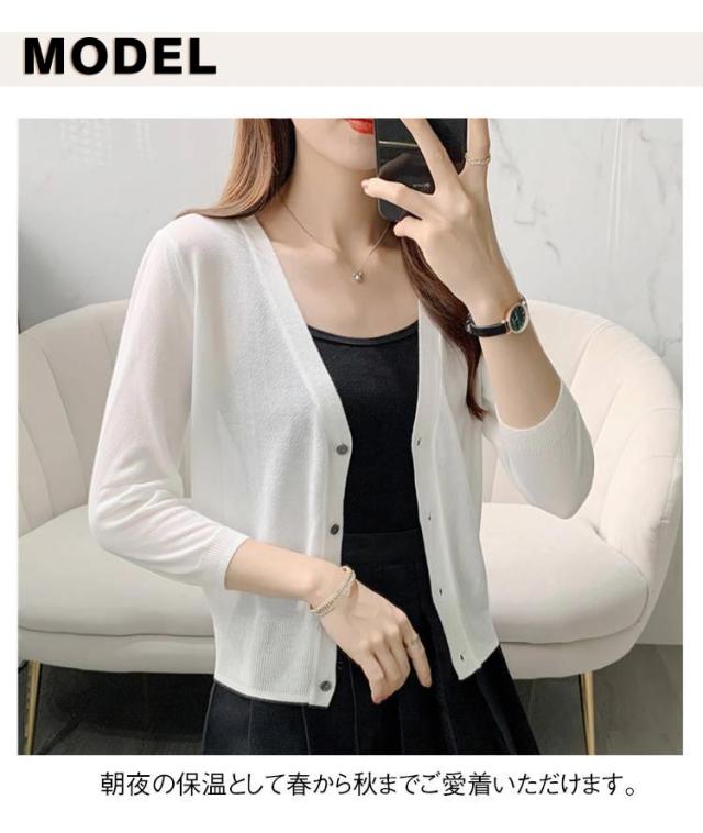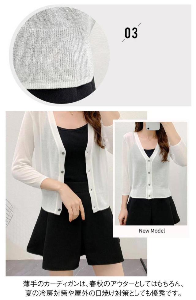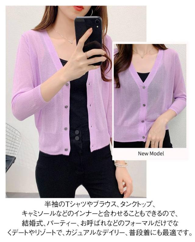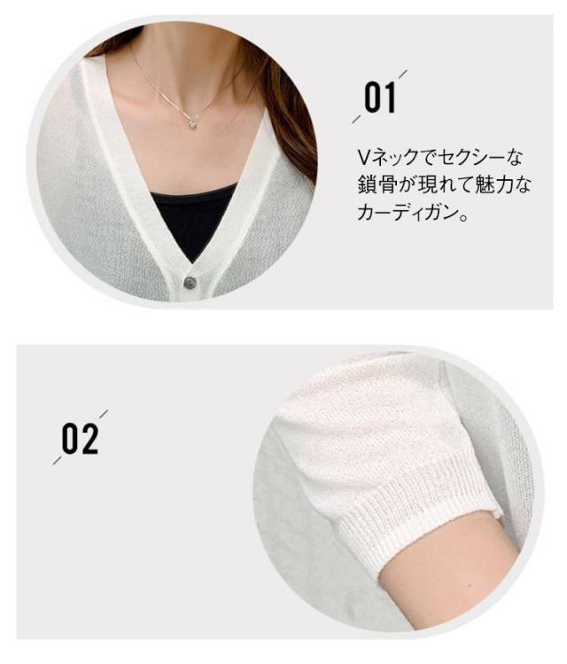 | 羽織りとして、UVカーディガンは薄手と長袖ので、室外の紫外線対策や冷房対策に定番アイテム。朝夜の保温として春から秋までご愛着いただけます。 Vネックでセクシーな鎖骨が現れて魅力なカーディガン。 薄手のカーディガンは、春秋のアウターとしてはもちろん、夏の冷房対策や屋外の日焼け対策としても優秀です。 半袖のTシャツやブラウス、タンクトップ、キャミソールなどのインナーと合わせることもできるので、結婚式、パーティー、お呼ばれなどのフォーマルだけでなくデートやリゾートで、カジュアルなデイリー、普段着にも最適です。 | |