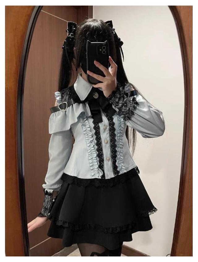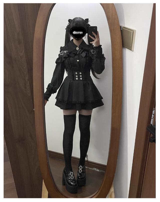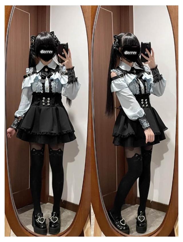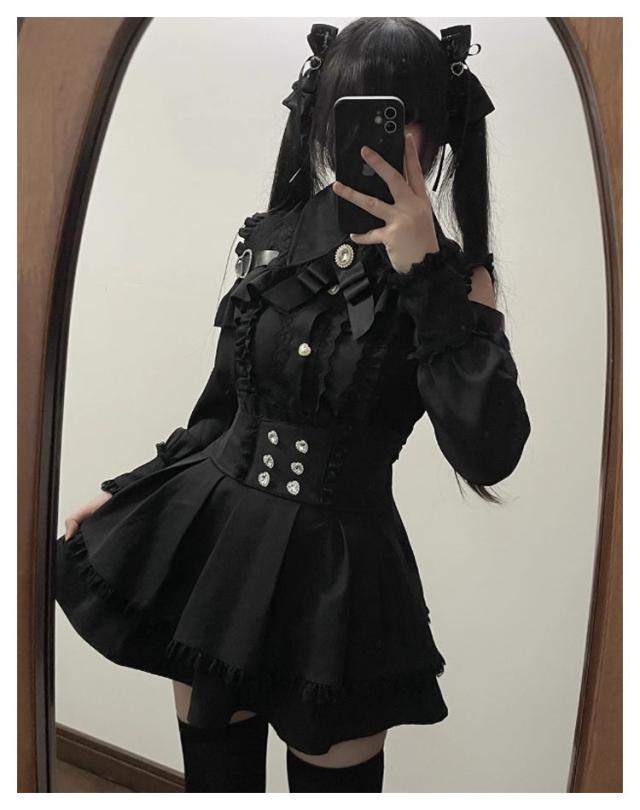 | 長袖トップス+ミニスカートのセットアップ。【黒?水色?赤】【S-XL】 ブラウス:お洒落なオープンショルダーのデザインで、女性らしいフェミニンな雰囲気が溢れる。肩にはキラキラしたハートバックル付きで可愛い。袖口にも黒レース付きで、華やかさがUP。リボンブローチが取り外し可能です。 ミニスカート:ウエストに付いている飾り用ハートボタンがポイント。Aライン&ハイウエストのスカートは着痩せ・高見え効果が抜群。ウエストにはゴム付きです。(インナーパンツなしです) 幅広く活躍:量産型、地雷系、ガーリー系、ロリータ系コーデにおすすめです。女子会、デートなど様々なシーンで幅広く活躍中。お洒落で可愛いデザインで、プレゼントとしてもピッタリです。 | |