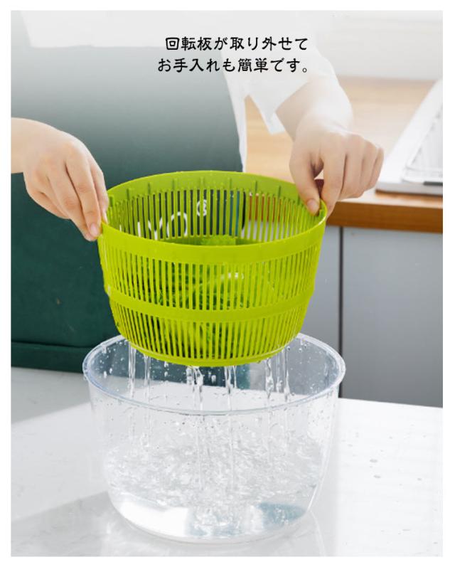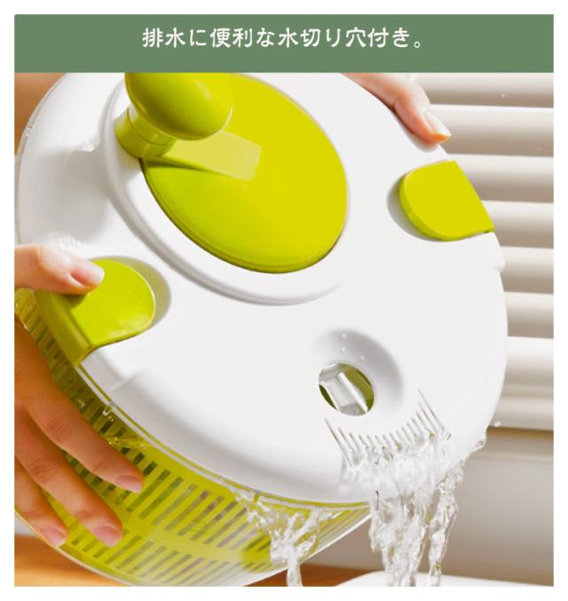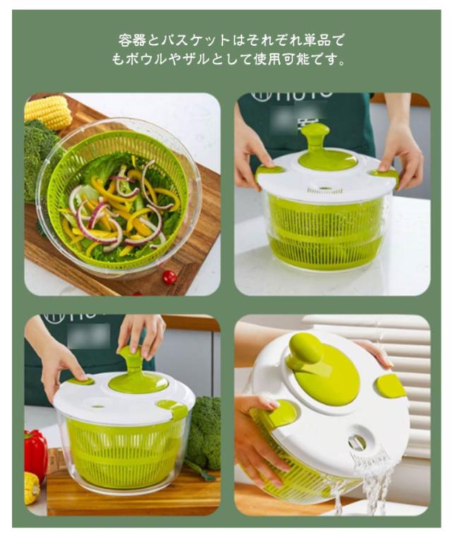 | ハンドルを回すだけで簡単に野菜の水切りが出来ます。【5L】 排水に便利な水切り穴付き。 回転板が取り外せてお手入れも簡単です。 容器とバスケットはそれぞれ単品でもボウルやザルとして使用可能です。 | |