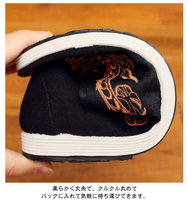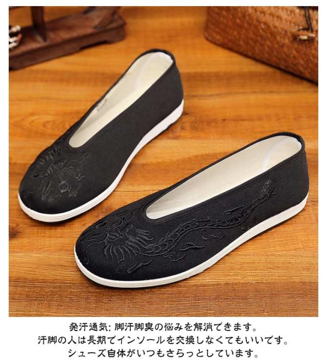 | 太極拳、気功だけではなく、多目的に使用できるカンフーシューズ。柔らかく通気性抜群の布靴。 ハンドメイドで施した中国風刺繍、ひとつひとつ手作業によってあしらわれる刺繍がなんとも言えない味をかもし出す、個性溢れる一足です。 床に吸い付くような安定感!当店のシューズはやわらかく、足にフィットしますので太極拳などの武術に最適です。高強度ゴム底は、強い摩擦力で安定性を高め、しっかりと床をつかんで安定した動きをサポートします。 柔らかく丈夫で、クルクル丸めてバッグに入れて気軽に持ち運びできます。 事務の人と車を長時問運転する人におすすめ。手作り布シューズは仕事中のストレスと疲労を改善できます。 発汗通気: 脚汗脚臭の悩みを解消できます。汗脚の人は長期でインソールを交換しなくてもいいです。シューズ自体がいつもさらっとしています。 | |