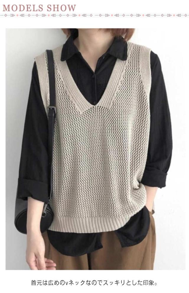 | シャツやカットソーの上に着て簡単にコーデ完成のノースリニット。 首元は広めのvネックなのでスッキリとした印象。 レトロな編み模様がおしゃれアクセント。 透かし編みの夏らしいデザインで季節感を演出♪ ゆったりとしたサイド感はレイヤードファッションに最適! | |