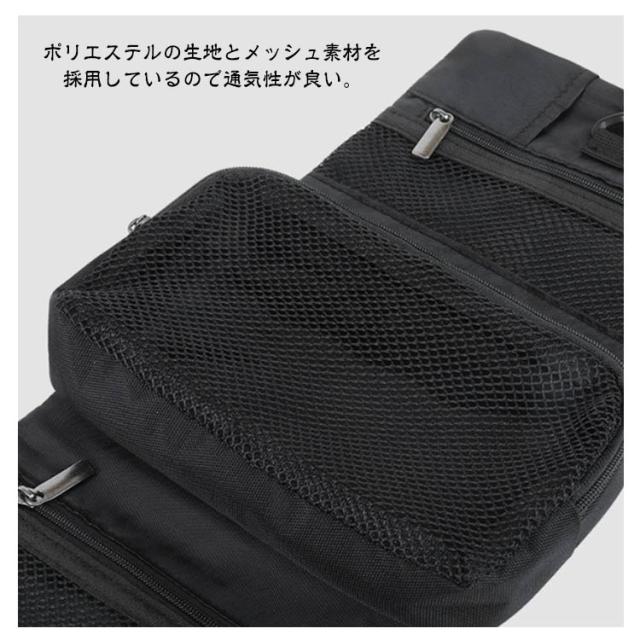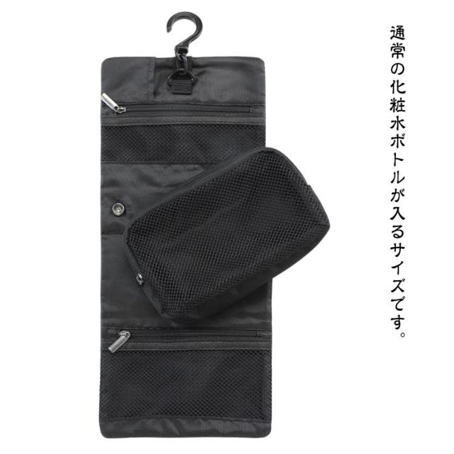 | ケースを広げるとバスルームのフックなどに吊して使えます。通常の化粧水ボトルが入るサイズです。 ポリエステルの生地とメッシュ素材を採用しているので通気性が良い。 吊り下げ収納は3ポケット分離されており、物を見分けることができ、大容量です。 軽量でコンパクトなので、バックパックやスーツケースに簡単に入れることができ、いつでもどこでも持ち運びに便利です。 化粧品だけでなく、洗面用具、ジュエリー、カミソリ、歯ブラシなども簡単に収納できるので、男性でも女性でもお使いいただけます。 | |