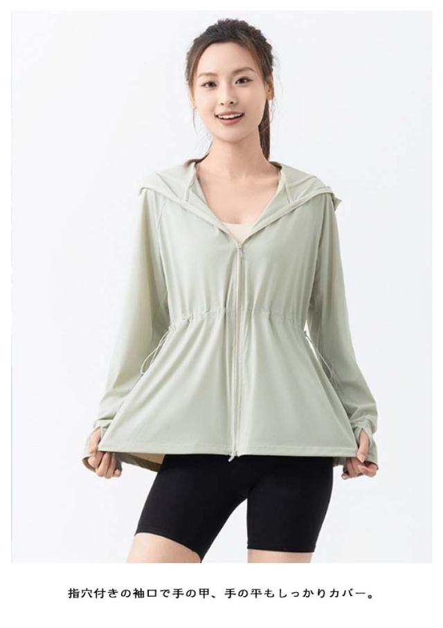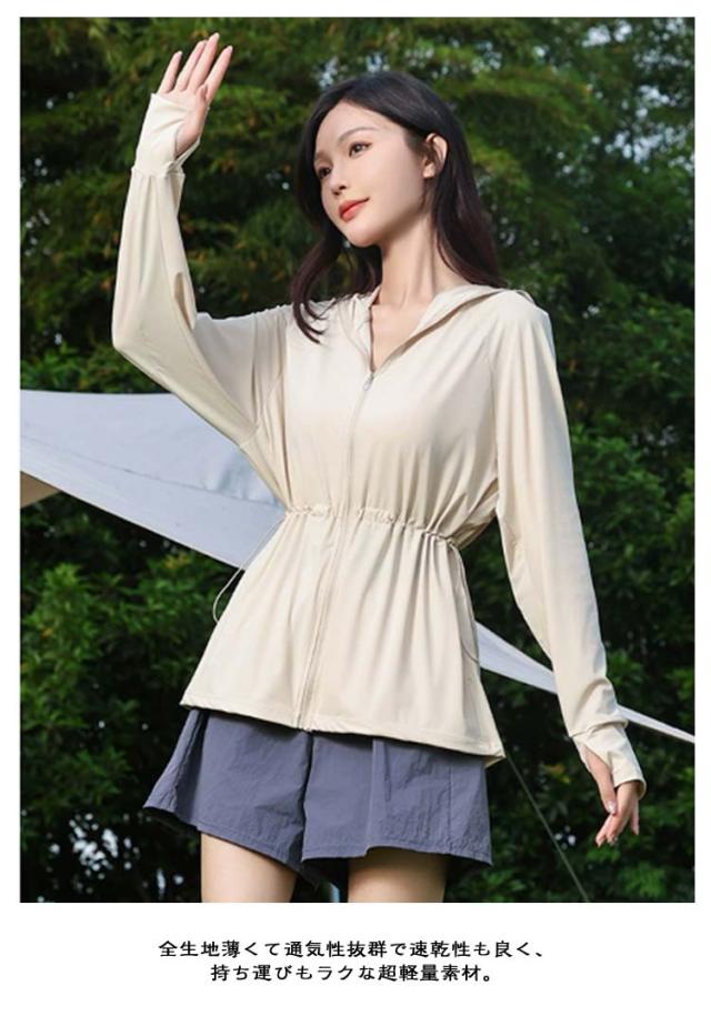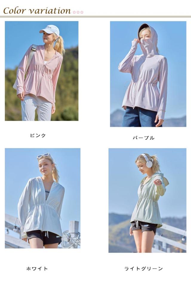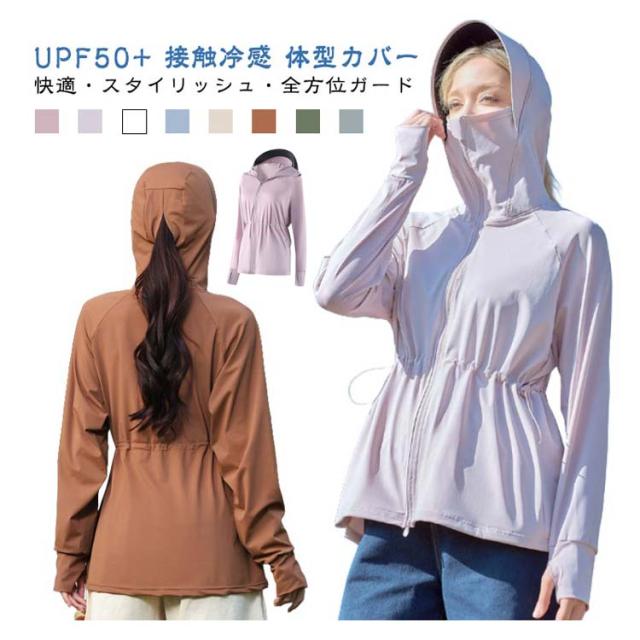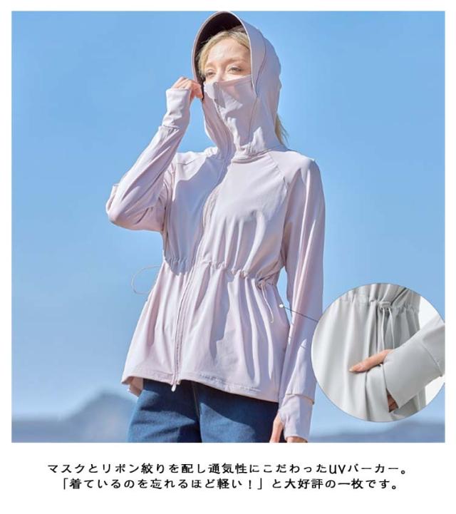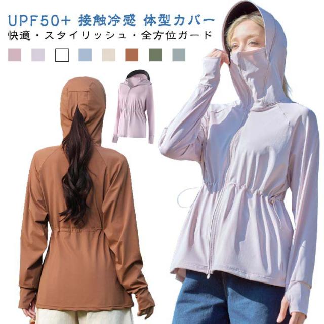 レディース 冷感 吸汗 手袋 UV パーカー マスク ラッシュガード UVカット UVパーカー 接触冷感 紫外線対策 指穴 つば付き ポニーテール ウエストゴム 調整可能 UPF50+ 速乾 UVケア UPF50+ フード付き トップス アウター 薄手